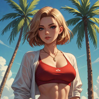 The image features a character that appears to be a female with blonde hair. She is wearing a one-piece swimsuit and standing on what seems to be a sandy beach, surrounded by tropical vegetation including palm trees. Her pose is confident and relaxed, as if she's enjoying her time at the beach. The character is designed in an artistic style commonly used for video games or digital illustrations. The overall scene suggests a leisurely or vacation atmosphere.