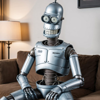The image shows a humanoid robot with a metallic body and a smiling face. The robot is sitting on the edge of a brown couch, posed in a relaxed manner with one hand on its knee and the other resting on the armrest of the couch. The setting appears to be a living room, as indicated by the presence of a couch and a lamp in the background. The robot is depicted in a way that suggests it has human-like qualities, which aligns with the science fiction genre where robots are often portrayed to mimic human behavior or appearance.