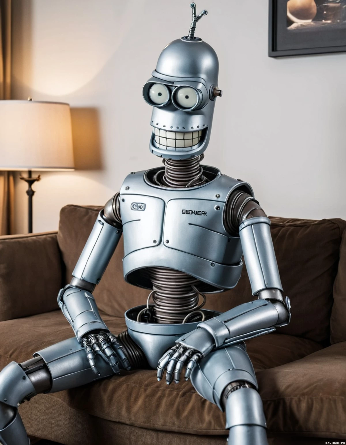 На картинке изображен гуманоидный робот с металлическим корпусом и улыбающимся лицом. Он сидит на краю коричневого дивана, поза непринужденная: одна рука на колене, другая – на подлокотнике. Судя по обстановке, это гостиная, о чем свидетельствует диван и лампа на заднем плане. Робот изображен так, что в нем прослеживаются человеческие черты, что характерно для научной фантастики, где роботов часто показывают, имитирующих человеческое поведение или внешность.