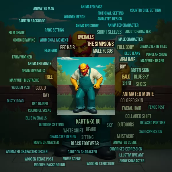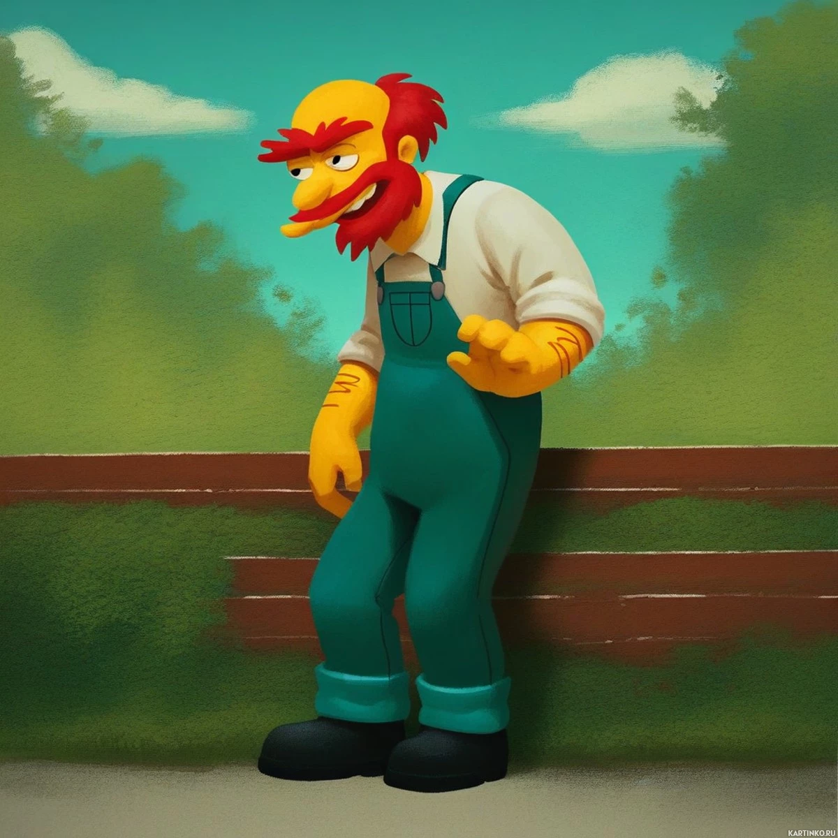 На картинке изображен персонаж, напоминающий Барни Гамбла из "Симпсонов". Он сидит на невысоком заборе, скрестив руки, и выглядит обеспокоенным или встревоженным. У него ярко-рыжие волосы, что характерно для его внешности в сериале. На персонаже синие комбинезон, что указывает на подходящий наряд для работы или домашних дел. На заднем плане простой пейзаж с деревьями и ясным небом, что позволяет предположить, что сцена происходит в пригороде или парке.