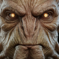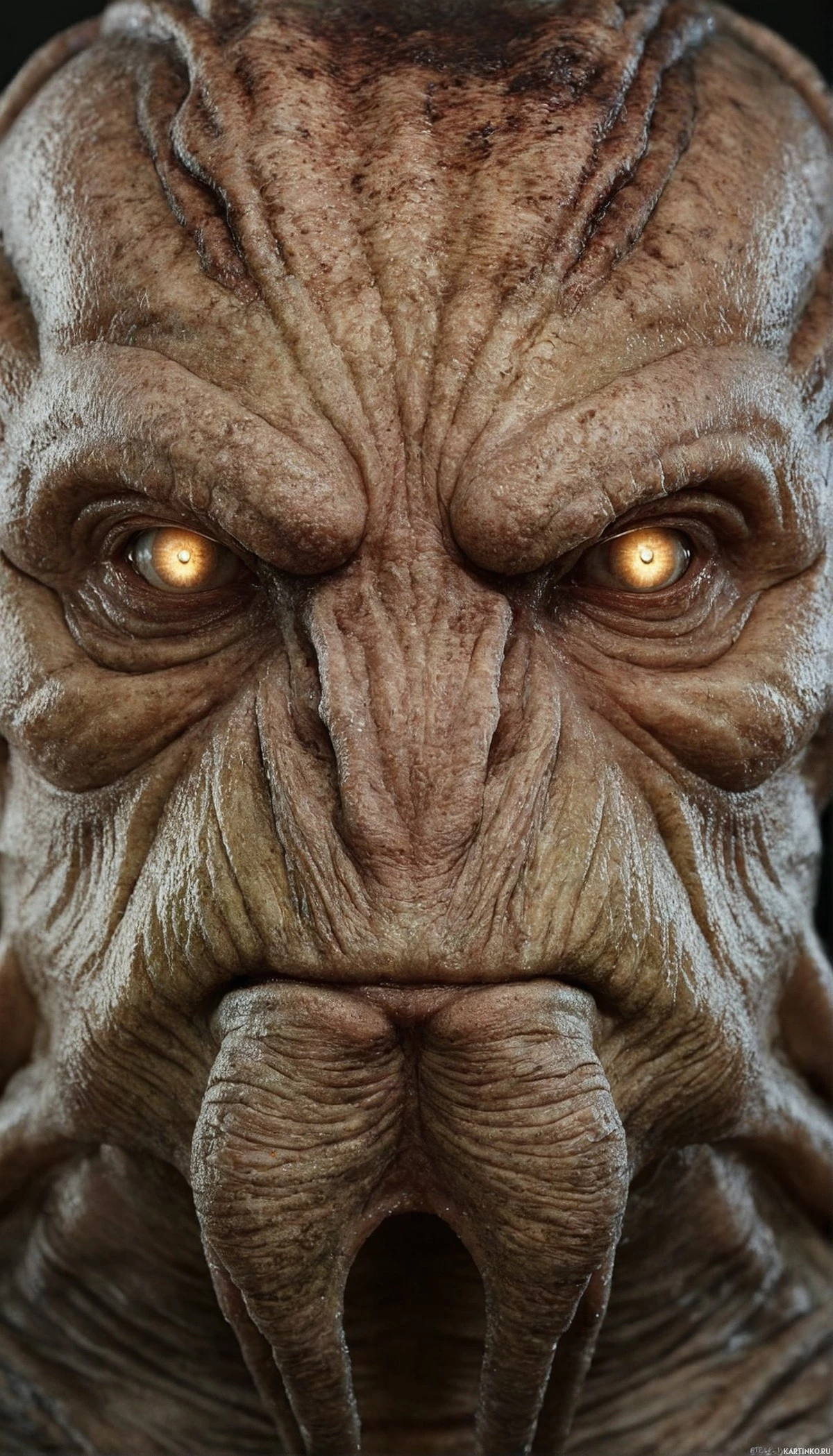 the rest of the face. There is a visible slit for a mouth that looks like it could be used for breathing underwater due to its size and structure, which might suggest a marine creature or amphibian-like appearance. The creature's skin has a rough texture, and there are ridges along the sides of the face that give an impression of