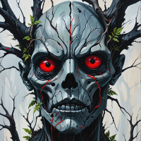 Картинка изображает фантастическое произведение искусства с гуманоидным существом, имеющим демонический или зловещий вид. У персонажа череп вместо головы, ярко-красные глаза, кажущиеся светящимися, и острые зубы. Кожа выглядит бледной, возможно, из-за крови, и на теле видны тёмные вены. Руки существа кажутся скелетистыми с когтеобразными пальцами. Лицо бесстрастное, но передаёт ощущение угрозы. Существо украшено различными элементами, усиливающими его жуткий облик. На черепе растут небольшие растения или почки, а сверху – тёмные ветви с листьями, напоминающие рога. Тело покрыто отметинами, которые можно интерпретировать как кровавые следы или некий вид ритуального украшения. В целом стиль картинки очень детализированный и драматичный, что говорит о её возможной связи с тематическим повествованием в фэнтезийном мире.
