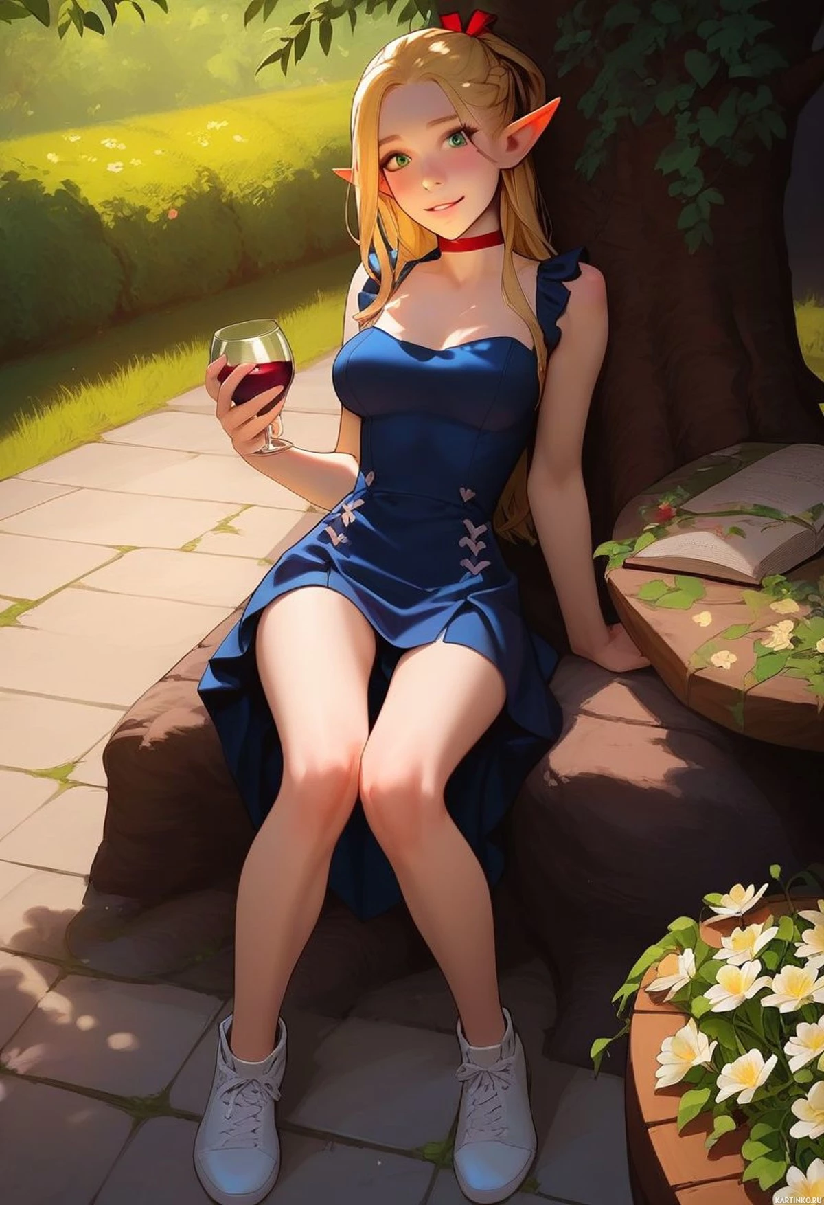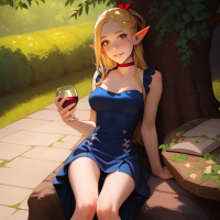 The image depicts a fantasy-themed illustration of a female character. She has blonde hair, is wearing a blue dress with what appears to be an elven design or style, and she holds a wine glass in her hand as if she's sipping from it. Her attire suggests that she might be portrayed as an elf or similar mythical creature within the fantasy genre. The setting seems to be outdoors during daylight, with greenery visible around her. The image is richly detailed and vibrant, capturing a moment of relaxation for the character.