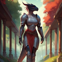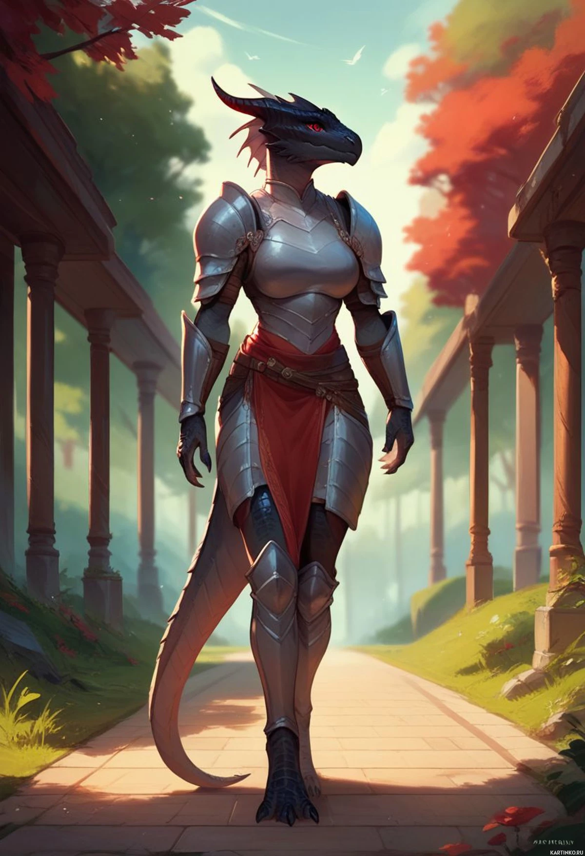 tail of a dragon, with scales and horns, but also stands upright on two legs like a human. It is dressed in armor that could be reminiscent of