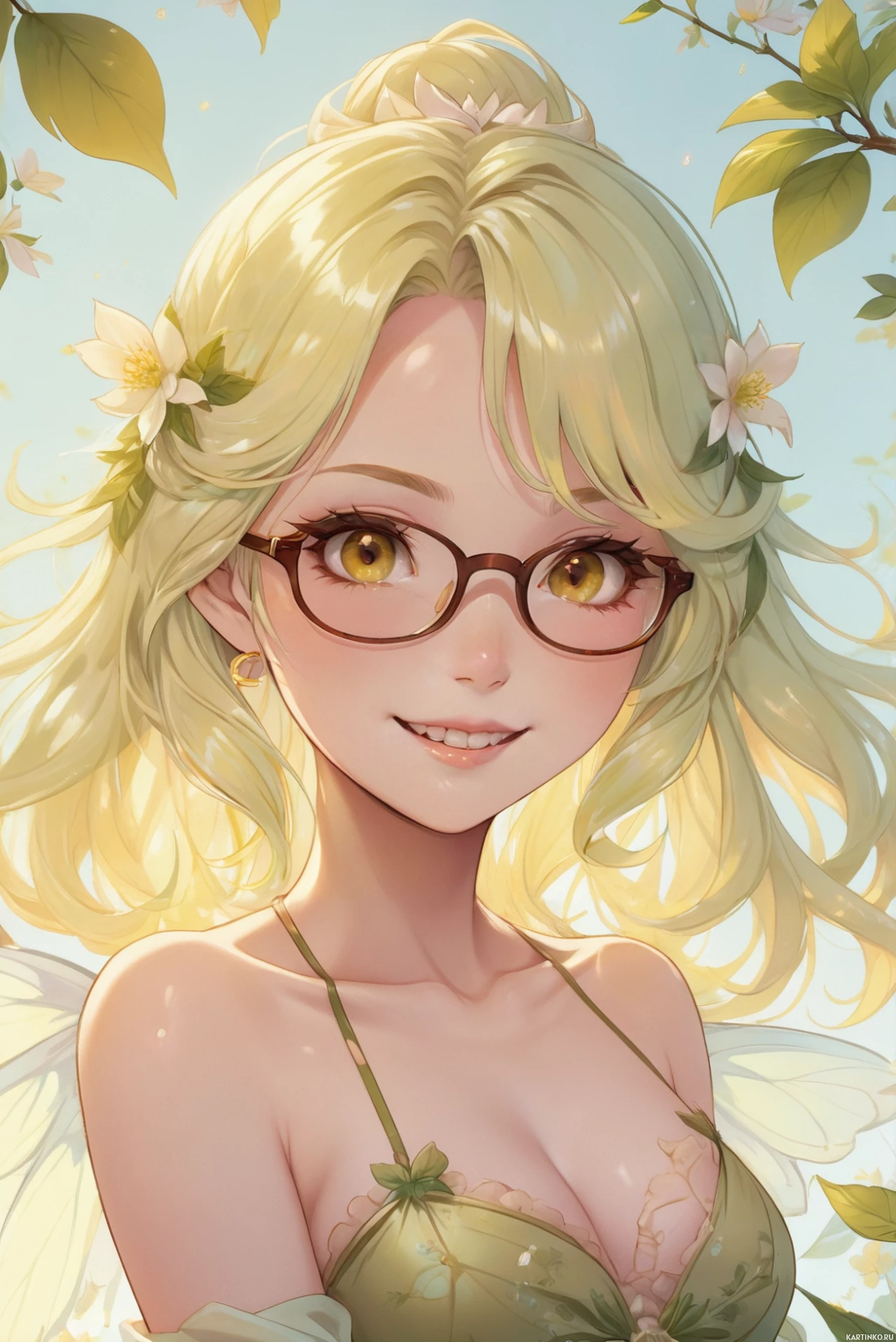 a female character with blonde hair and striking blue eyes. She is smiling at the viewer, wearing glasses that add to her charm. Her ears are adorned with what appears to be a small flower or leaf design, hinting at an elf-like nature. She is dressed in a costume that includes