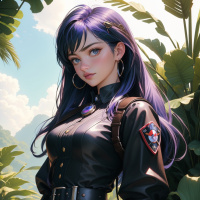 The image features a young woman with vibrant purple hair and a confident expression. She is wearing a black leather outfit that includes a jacket, pants, and boots. The attire appears to be detailed with buckles and straps. The setting includes lush green foliage around her, suggesting she might be in a forest or jungle-like environment. Her stance is assertive, as if posing for the picture.