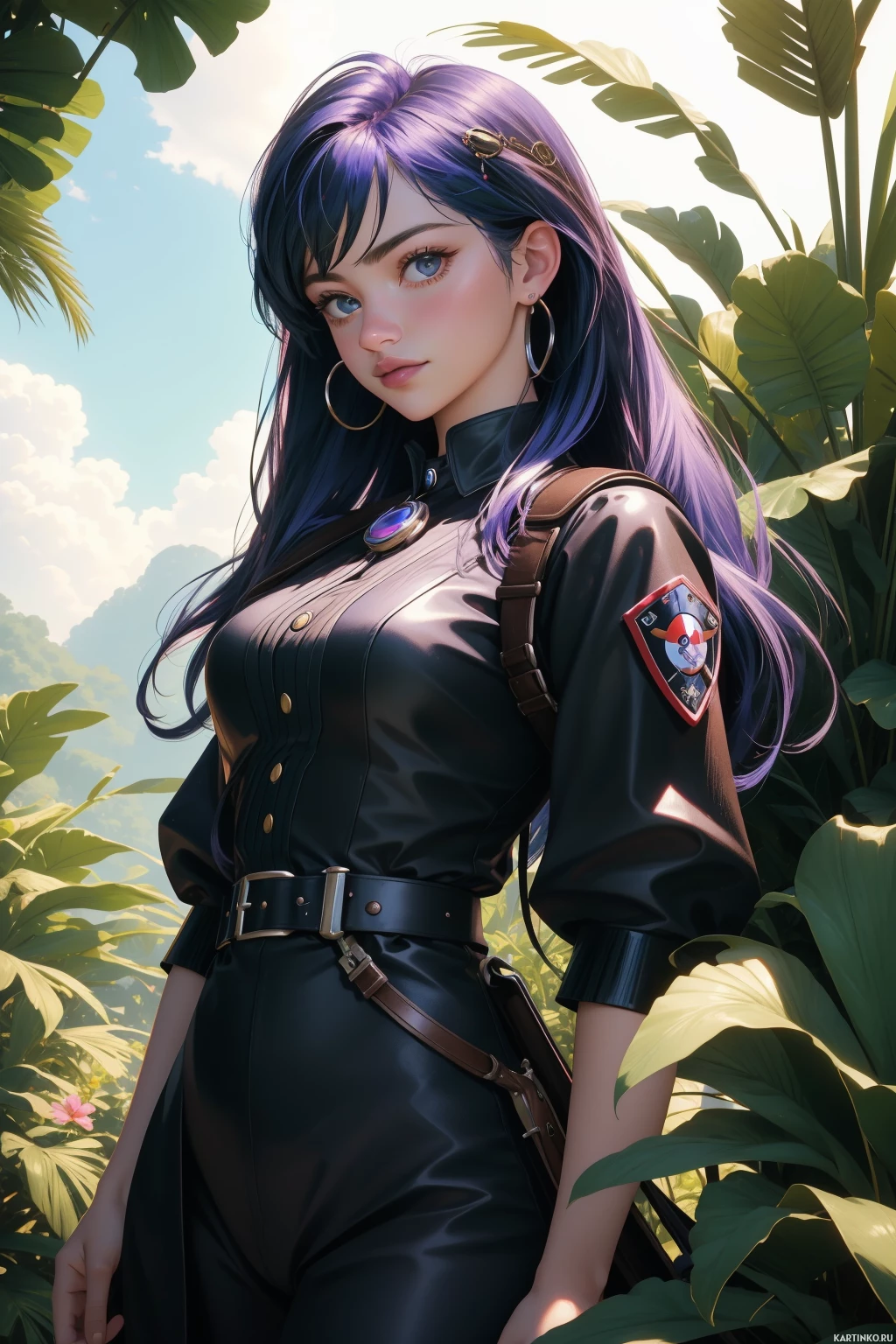 На картинке запечатлена молодая женщина с яркими фиолетовыми волосами и уверенным выражением лица. На ней черная кожаная одежда: куртка, брюки и сапоги, украшенные застежками и ремнями. Вокруг нее пышная зелень, создающая ощущение леса или тропической местности. Поза у нее властная, словно она позирует для фотографии.