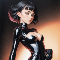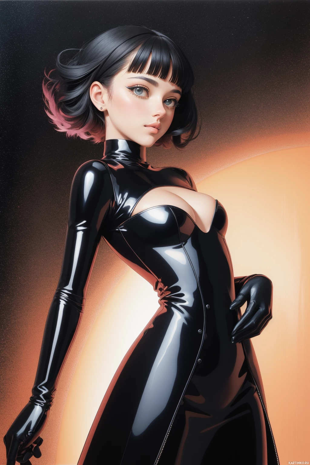 leather outfit that resembles the iconic costume of Cat Noir from the animated television series "Miraculous: Tales of Ladybug & Cat Noir." The character is set against a backdrop that gives off a sense of space or another dimension, possibly hinting at her