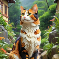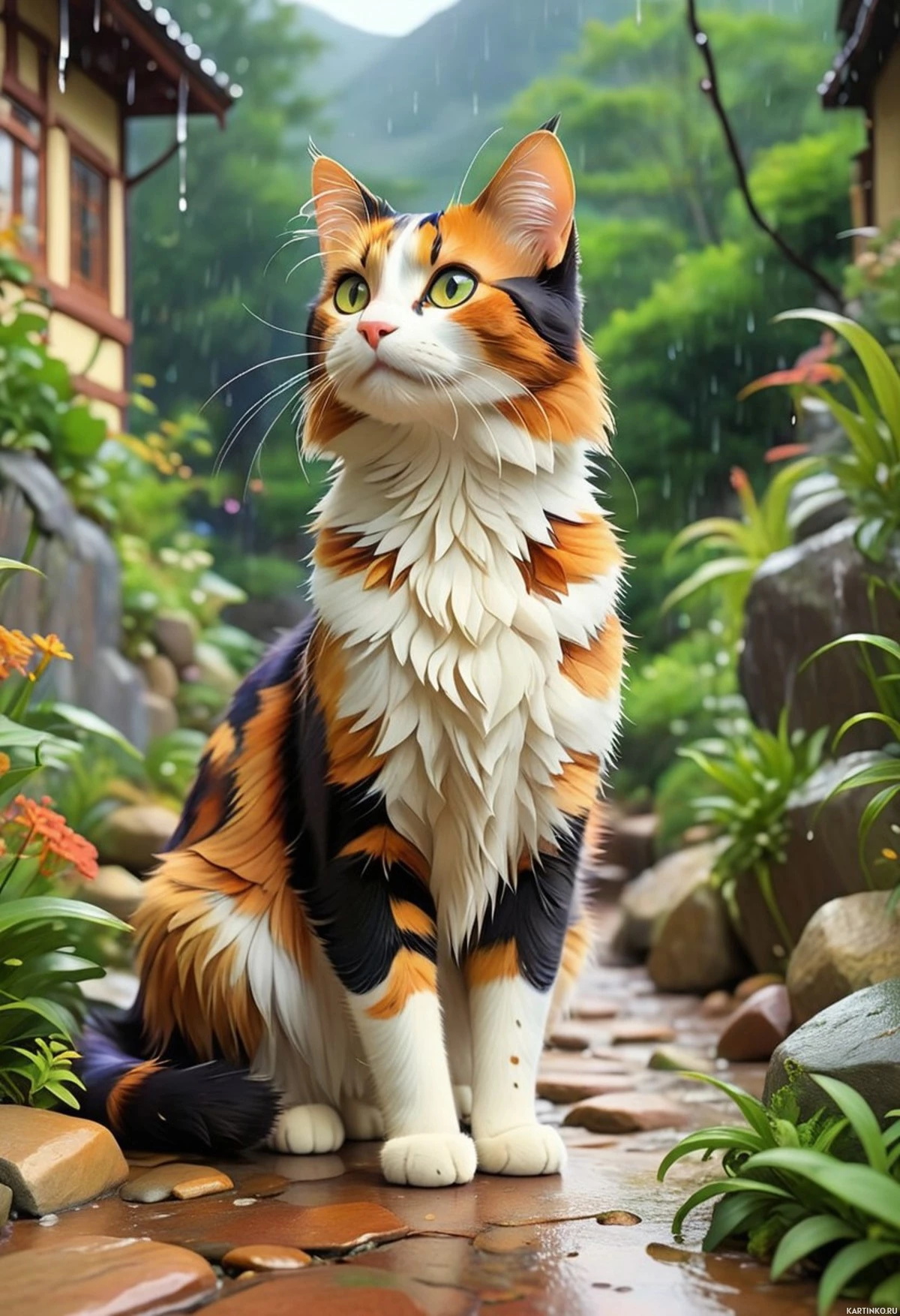 На картинке сидит кот с рыже-черной шерстью на каменистой тропинке. Его глаза широко раскрыты, кажется, он смотрит в сторону, немного приоткрыв рот. На заднем плане – пышная растительность, маленькие деревья и цветы, а также традиционная японская постройка, возможно, часть храма или беседки. Над ними – пасмурное небо, на листьях видны капли дождя, что говорит о том, что либо недавно был дождь, либо он вот-вот начнется. Общая атмосфера картинки умиротворяющая и живописная.