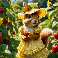 yellow dress with a floral pattern and a white bonnet. The squirrel is holding