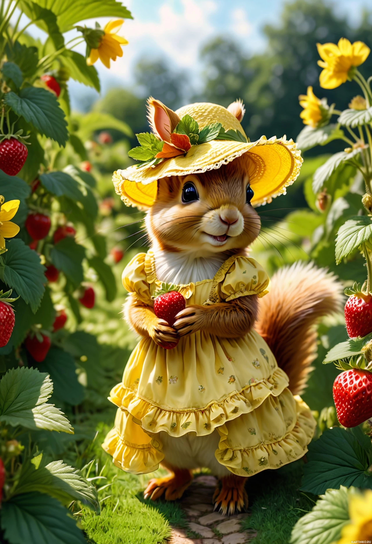 a red strawberry. It wears a sunny yellow hat that matches its dress, adorned with a light