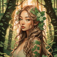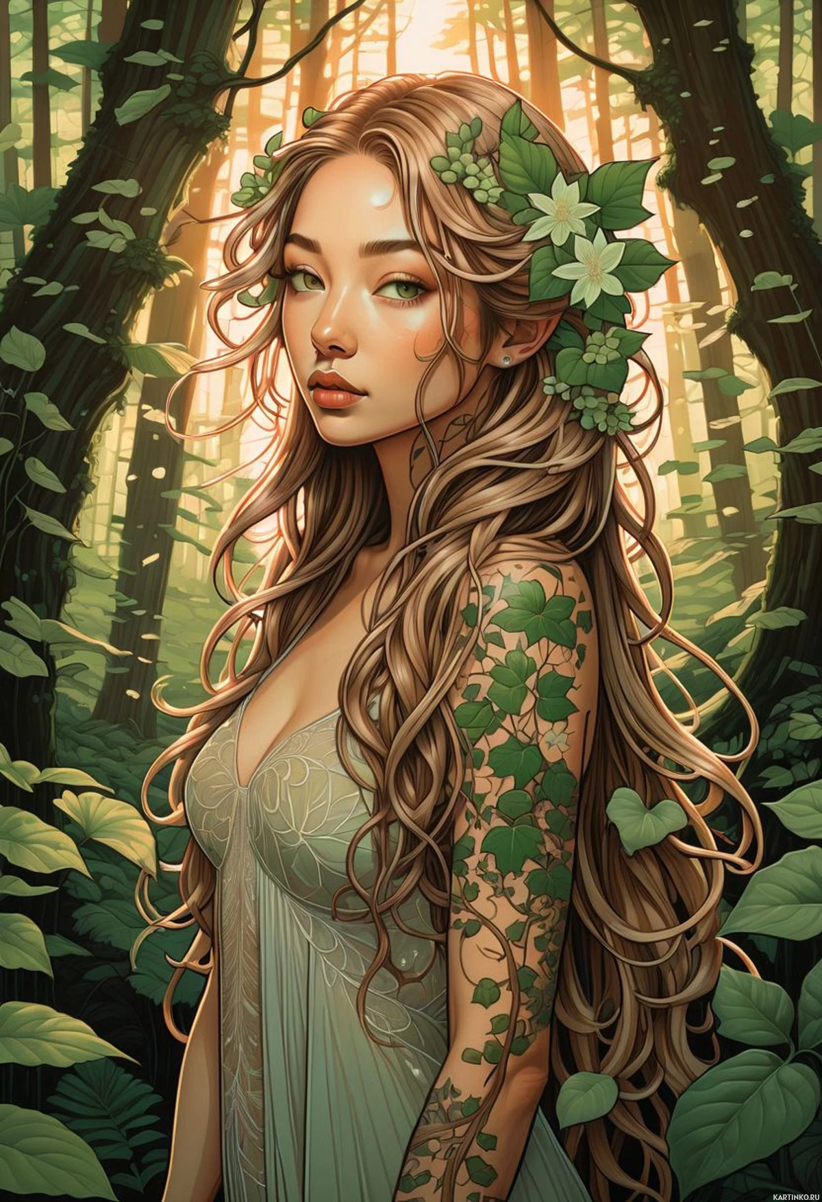 Картинка представляет собой иллюстрацию в стиле фэнтези, изображающую эльфа в лесу. В центре – молодая девушка с заострёнными ушами, характерной чертой эльфов, чьи волосы словно сливаются с окружающей природой. Её кожа светлая, возможно, из-за её сказочной природы. На её плечах и руках – зелень или цветы, что подчёркивает её связь с природой. Она одета в платье без рукавов светлого зелёного цвета, гармонирующее с окружающей средой, с цветочным узором, напоминающим листья. На заднем плане буйная зелень и мягкий солнечный свет создают неземную атмосферу. Деревья и листва заполняют края кадра, направляя взгляд зрителя к центральной фигуре. Общая цветовая палитра мягкая, пастельная, что усиливает ощущение сказочности картинки. Такие работы часто ассоциируются с жанром фэнтези или могут быть использованы как концепт-арт для видеоигр, фильмов или книг с эльфами или подобными мифическими существами в лесной обстановке.