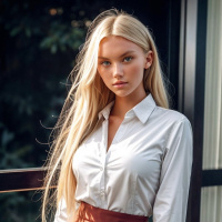 На картинке изображена женщина, стоящая на природе. На заднем плане видны деревья и зелень. На ней рубашка с воротником и юбка. У неё длинные светлые волосы, уложенные мягкими волнами. Освещение указывает на то, что сейчас либо поздний вечер, либо ранняя вечерняя пора.