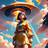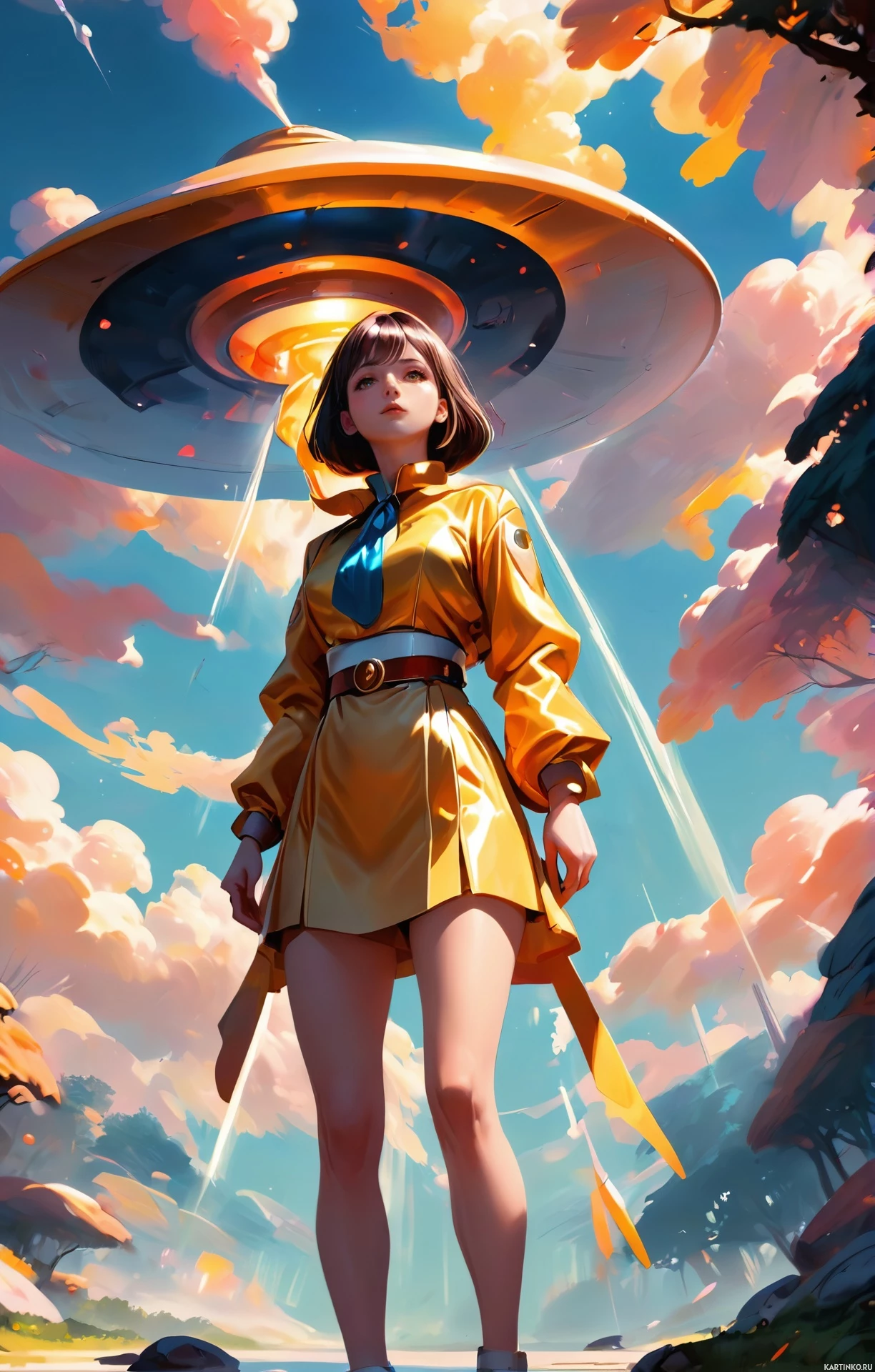 На картинке молодая женщина стоит на зеленой лужайке, повернувшись корпусом вправо, а головой – к зрителю. На ней яркое желтое платье, которое выделяется на фоне зелени. Над ее головой парит инопланетный НЛО с красным светящимся центром и лучами света, расходящимися во все стороны. На заднем плане – чистое голубое небо с облаками, а слева видны две массивные конструкции, похожие на древние руины или храмы. Стиль рисунка намекает на связь с фантастикой.