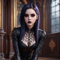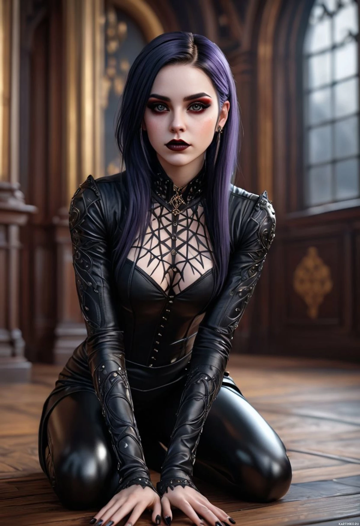 На картинке изображена молодая женщина с фиолетовыми волосами. У неё пронзительный взгляд и, кажется, сложный макияж вокруг глаз. Она одета в тёмный облегающий наряд из кожи или латекса, включая ботфорты. За ней виднеется помещение с элементами классической архитектуры, такими как колонны и панели. С потолка свисает изысканный люстр, добавляющий сцене роскоши.