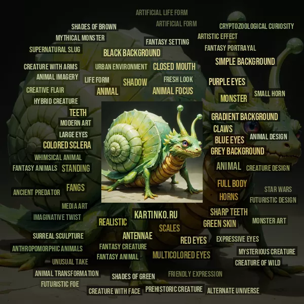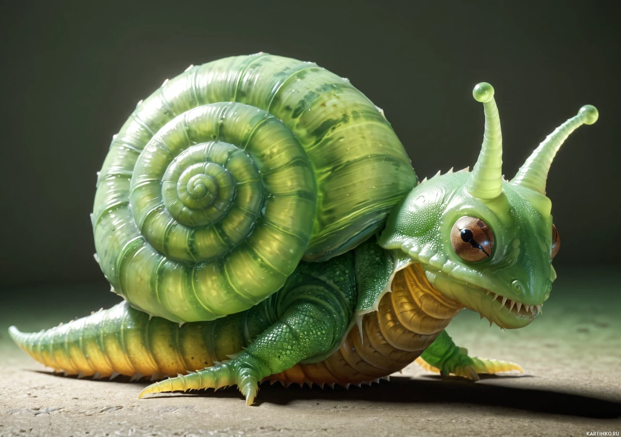 The image features a creature that appears to be a blend between a snail and a dragon. The head of the creature resembles a dragon with spiky ears,