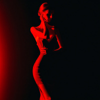 The image depicts a woman wearing a sleeveless black dress with a high neckline and off-the-shoulder design. She has her right hand gently placed on the side of her face, near her eyes, suggesting a pose that could convey contemplation or introspection. The background is monochromatic with a deep red hue, which contrasts with the woman's dark dress and creates a dramatic effect.