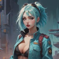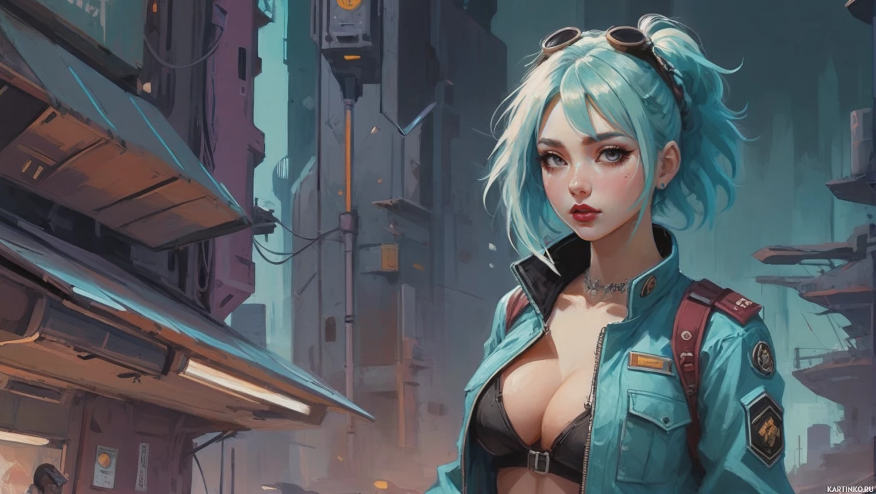 На этой картинке – цифровой арт с героиней. У неё бирюзовые волосы и она одета в светло-голубую куртку с каким-то знаком, что намекает на военное или правоохранительное прошлое. Героиня стоит на фоне индустриального пейзажа, похожего на часть большого города, возможно, космопорта, судя по сооружениям, напоминающим стыковочные шлюзы. Вокруг – трубы и различное оборудование. Её поза уверенная, руки на бёдрах, на лице – выражение самодовольства. В целом, стиль картинки напоминает концепт-арт для видеоигр или научно-фантастических историй.