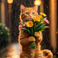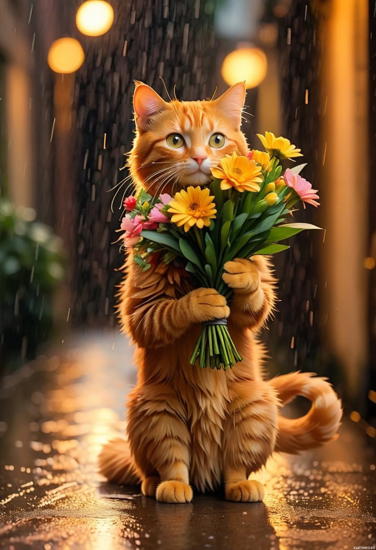 street at night. It is holding a bouquet of flowers in its paws, and it appears to be rain-soaked from the downpour indicated by the reflections on the pavement and the raindrops visible against