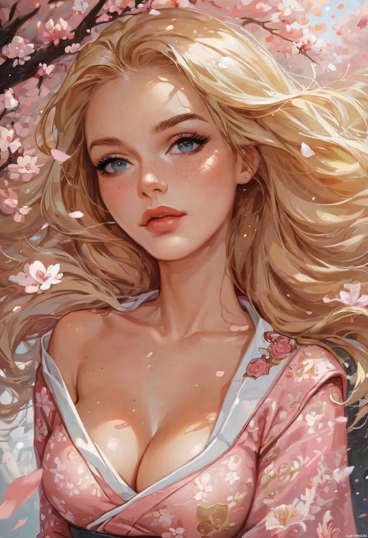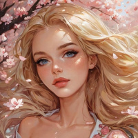 pink blossoms, contributing to a serene and colorful setting. The artwork exhibits a high