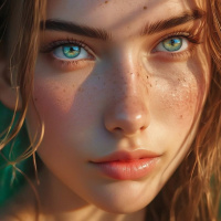 blue color and she has a subtle glow around them, suggesting that it might be sunlight. She appears to have a natural complexion and is wearing