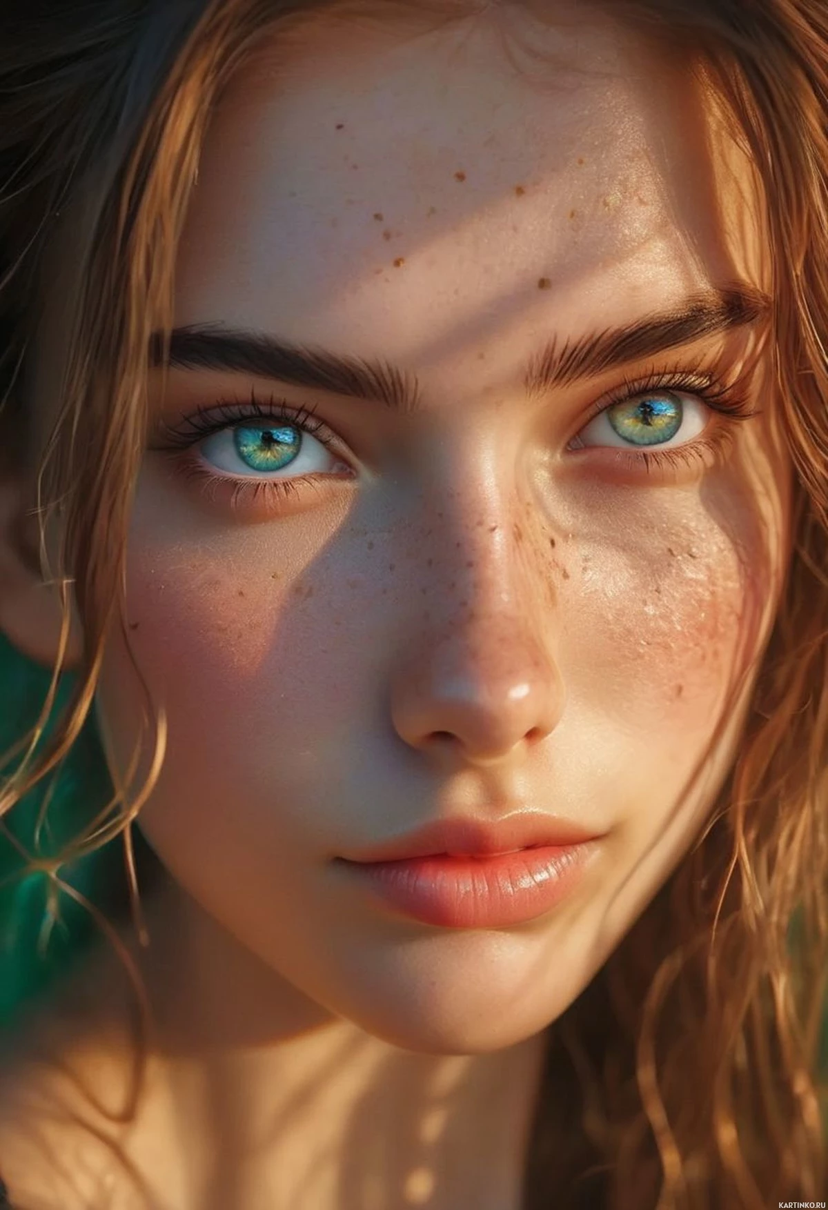 a young woman's face, with her looking directly at the camera. Her eyes have a striking