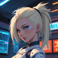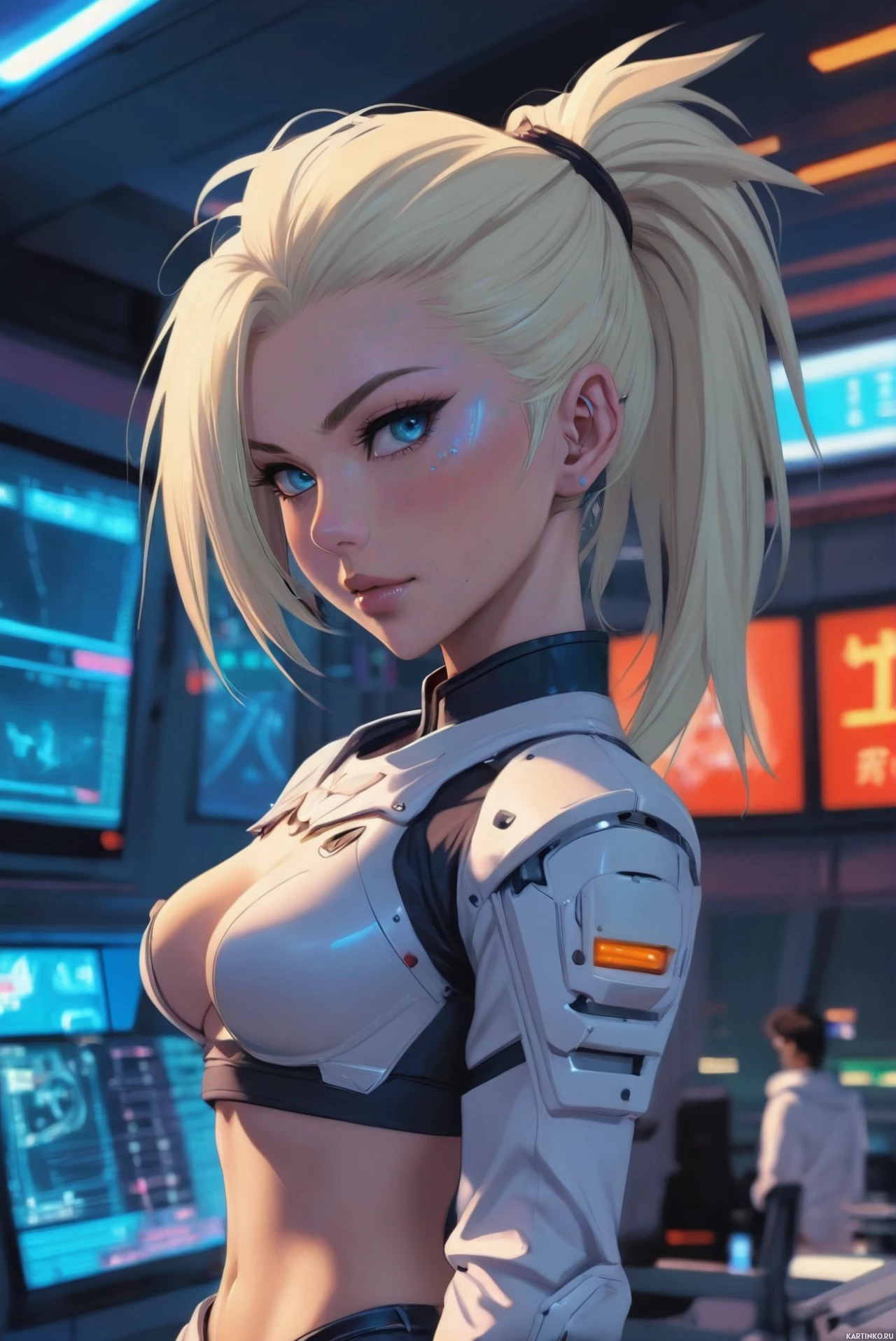 blue eyes and is wearing a futuristic-looking outfit, which includes a metal chest plate with a graphic design on it and what appears to be an energy bar or emblem on her left arm. The character is set against the backdrop of a spacecraft's