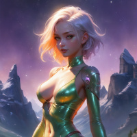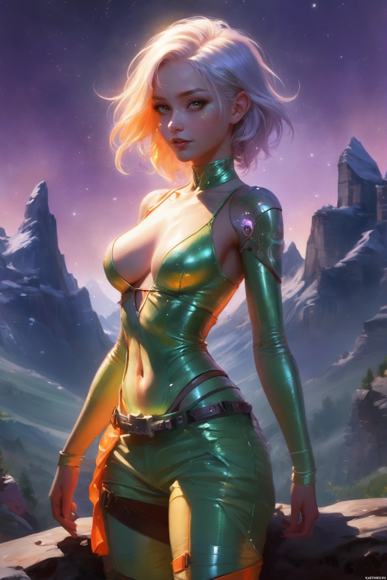 На картинке изображена женщина с белыми волосами, стоящая на фоне горного пейзажа. На ней облегающий зелёный комбинезон, украшенный декоративными элементами, похожими на драгоценные камни или медали. Её поза уверенная и грациозная. На заднем плане – возвышающиеся вершины под сумеречным небом, создающим ощущение либо рассвета, либо заката, благодаря цветам и освещению.