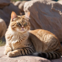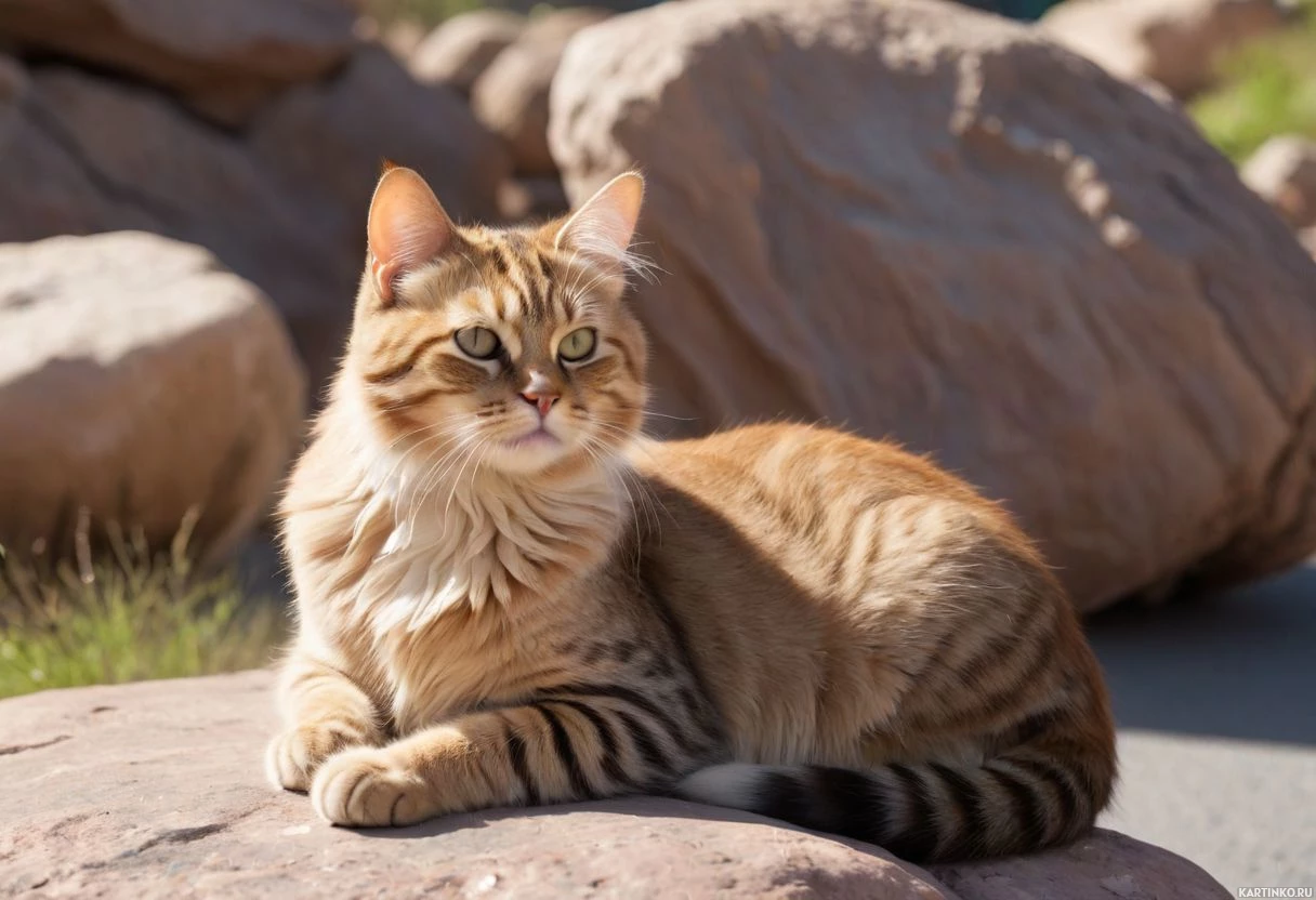 a fluffy cat with distinctive stripes and markings. It appears to be sitting on