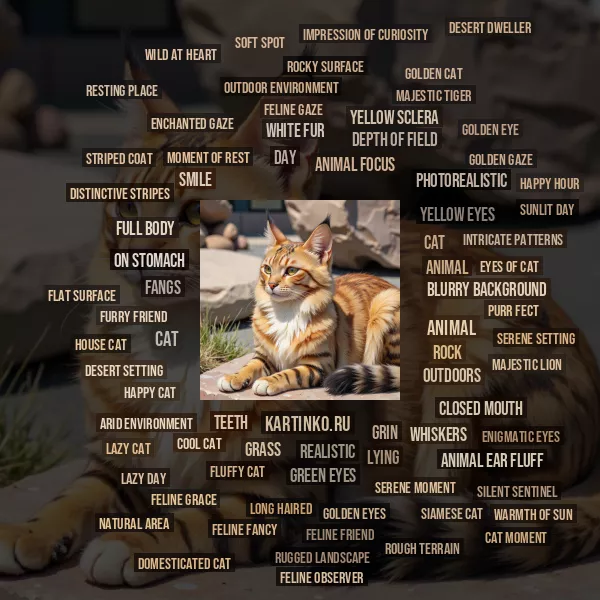 a flat surface, which could be a wall or concrete ground, set against a backdrop of natural stone or rock formations. The cat is attentively looking towards something off-frame with its ears perked up, giving