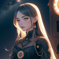 The image features a female character who appears to be a blend of fantasy and modern elements. She has long, pale hair that is styled in a way that suggests movement or wind. Her expression is serious or contemplative. She wears a dark dress with intricate designs, giving her an elegant and somewhat otherworldly appearance. In the background, there's a glimpse of what seems to be a city at night, including a lit clock tower. The style of the image is digital artwork, combining realistic human features with fantastical elements like her hair and attire.