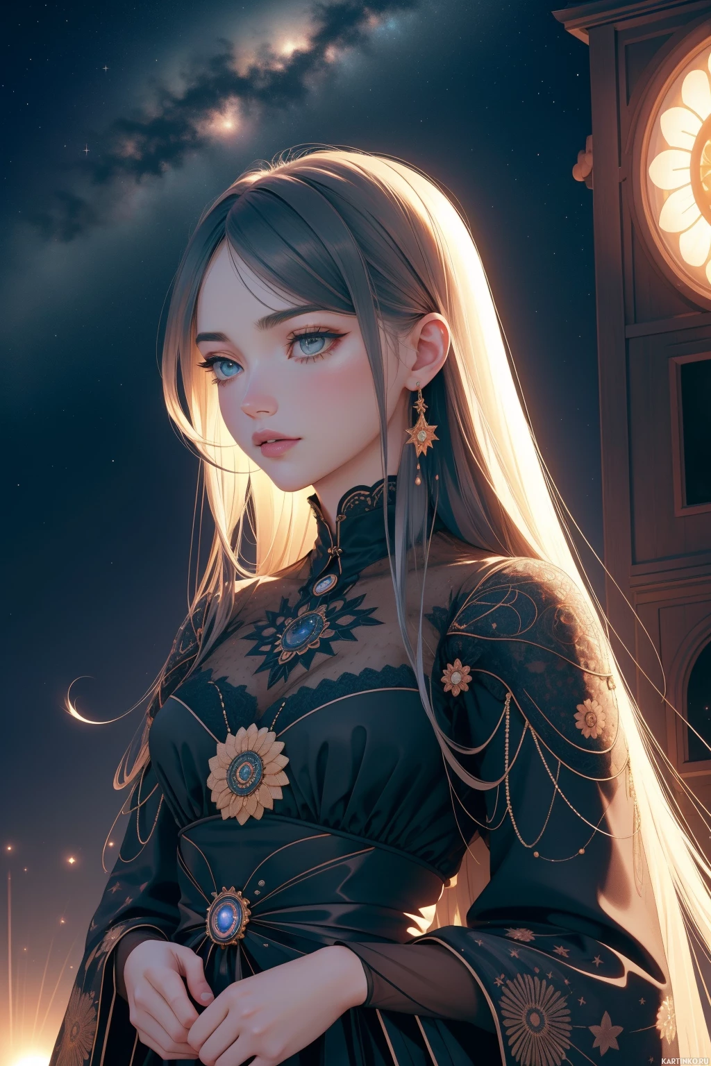 На картинке изображена девушка, сочетающая в себе черты фэнтези и современности. У неё длинные светлые волосы, словно трепещущие на ветру. Выражение лица серьёзное или задумчивое. Она одета в тёмное платье, украшенное замысловатыми узорами, что придаёт ей элегантный и немного неземной вид. На заднем плане виднеется силуэт ночного города, в том числе освещённая часовая башня. Стиль картинки – цифровая живопись, сочетающая реалистичные черты лица с фантастическими деталями, такими как её волосы и наряд.