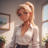blonde hair and is looking directly at the viewer with a slight smile. She's wearing a light-colored top that is unbuttoned, revealing her cleavage, and she appears to be wearing