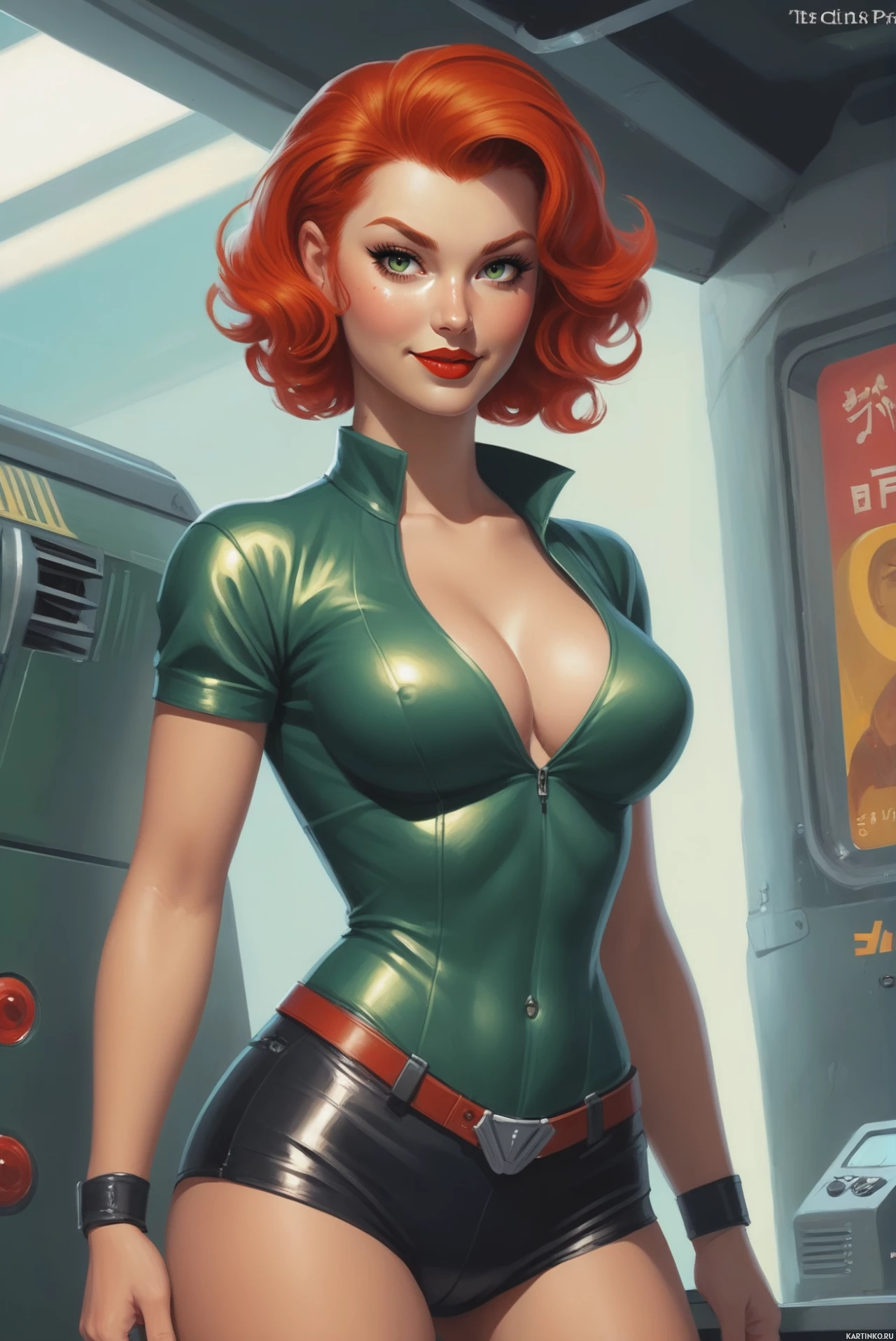 На картинке изображена девушка с рыжими волосами, подстриженными в стиле боб, в зеленой жилетке без рукавов и черных шортах. Она стоит в кабине, похожей на кабину космического корабля или транспортного средства, с металлическим каркасом и панелью управления с приборами позади нее. Картина выполнена в технике цифровой живописи с уровнем детализации, который может намекать на комикс или игру.