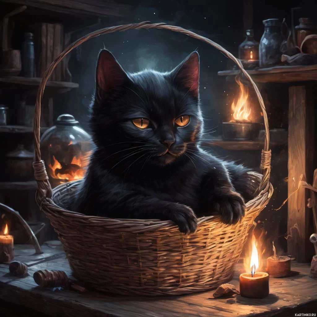 the soft glow from the candles. The cat appears calm and relaxed in its basket, adding to the overall serene mood of the image.