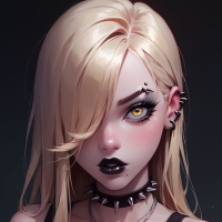 The image shows a stylized character that appears to be a young woman with blonde hair. She has pronounced, doll-like features, including large expressive eyes and prominent eyebrows. Her makeup includes dark lipstick and what seems to be fake tears or mascara around her eyes, adding a dramatic effect to her appearance. The character is wearing what appears to be a black corset top with a cross pendant visible. She has a distinctive accessory on her right temple: a black feather that could also be interpreted as an earring or a hairpiece with a skull design. The overall style of the image suggests it could be related to the gothic, emo, or alternative fashion subcultures.