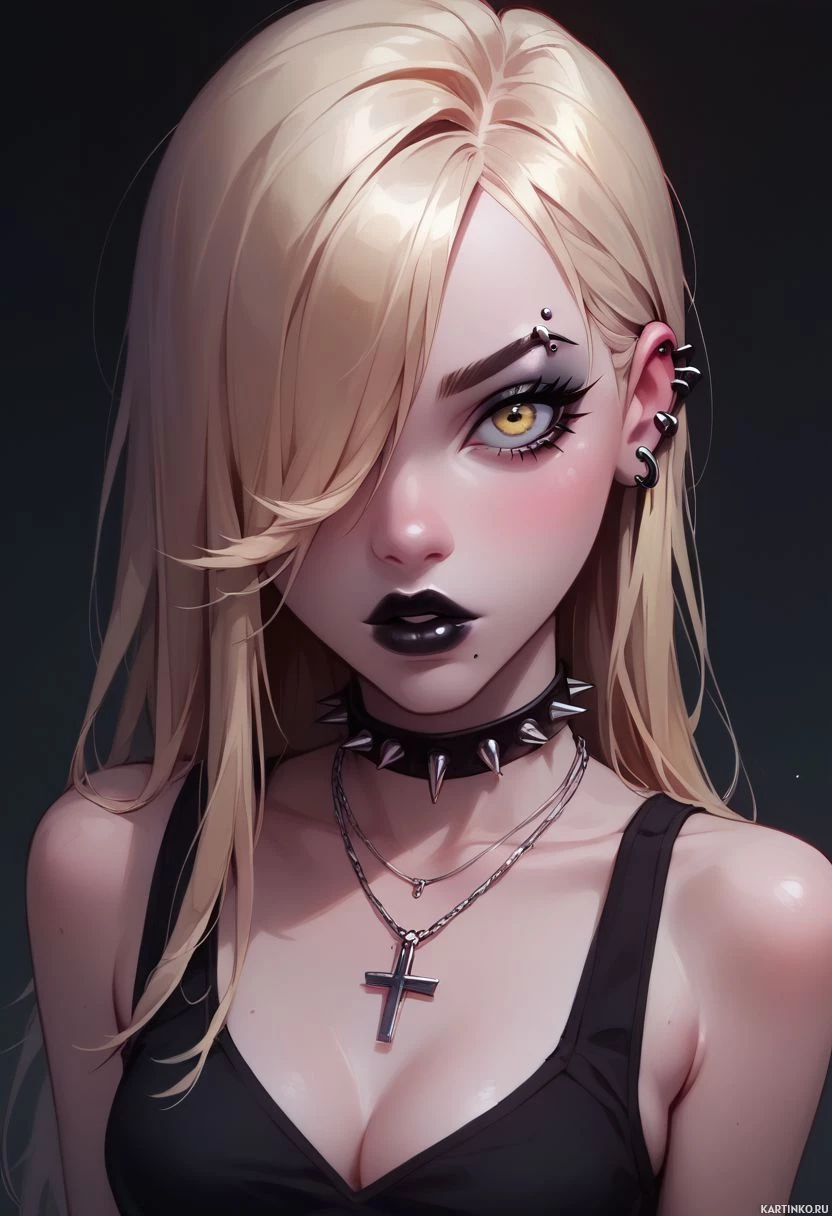 На картинке изображен стилизованный персонаж, похожий на молодую женщину с светлыми волосами. У нее выразительные черты лица, напоминающие кукольные, включая большие глаза и густые брови. Макияж включает темную помаду и, кажется, искусственные слезы или размазанная тушь вокруг глаз, что придает ее облику драматизм. На ней, похоже, черный корсет с видимым крестом. На ее правом виске – необычный аксессуар: черное перо, которое можно интерпретировать как серьгу или заколку для волос в виде черепа. В целом, стиль картинки указывает на принадлежность к готической, эмо или альтернативной моде.