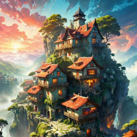 video game or animated representations of medieval architecture. The sky in the background has dramatic clouds and the sun is setting, casting a warm glow over the entire scene and highlighting the village as the focal point. This picture can be considered an illustration rather than a photograph due to its fantastical elements and artistic style.