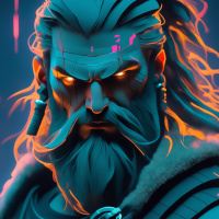 The image depicts a male character with a beard and mustache, wearing what appears to be futuristic or science fiction-themed armor. His hair is styled in a way that suggests he may have a fierce or intense personality. He has glowing eyes that could indicate some form of cybernetic enhancement or otherworldly powers. The character's expression is serious and his gaze seems to be directed off-camera, which adds a sense of intensity to the image. The art style suggests it might be related to video games or graphic novels set in a futuristic or fantasy universe.