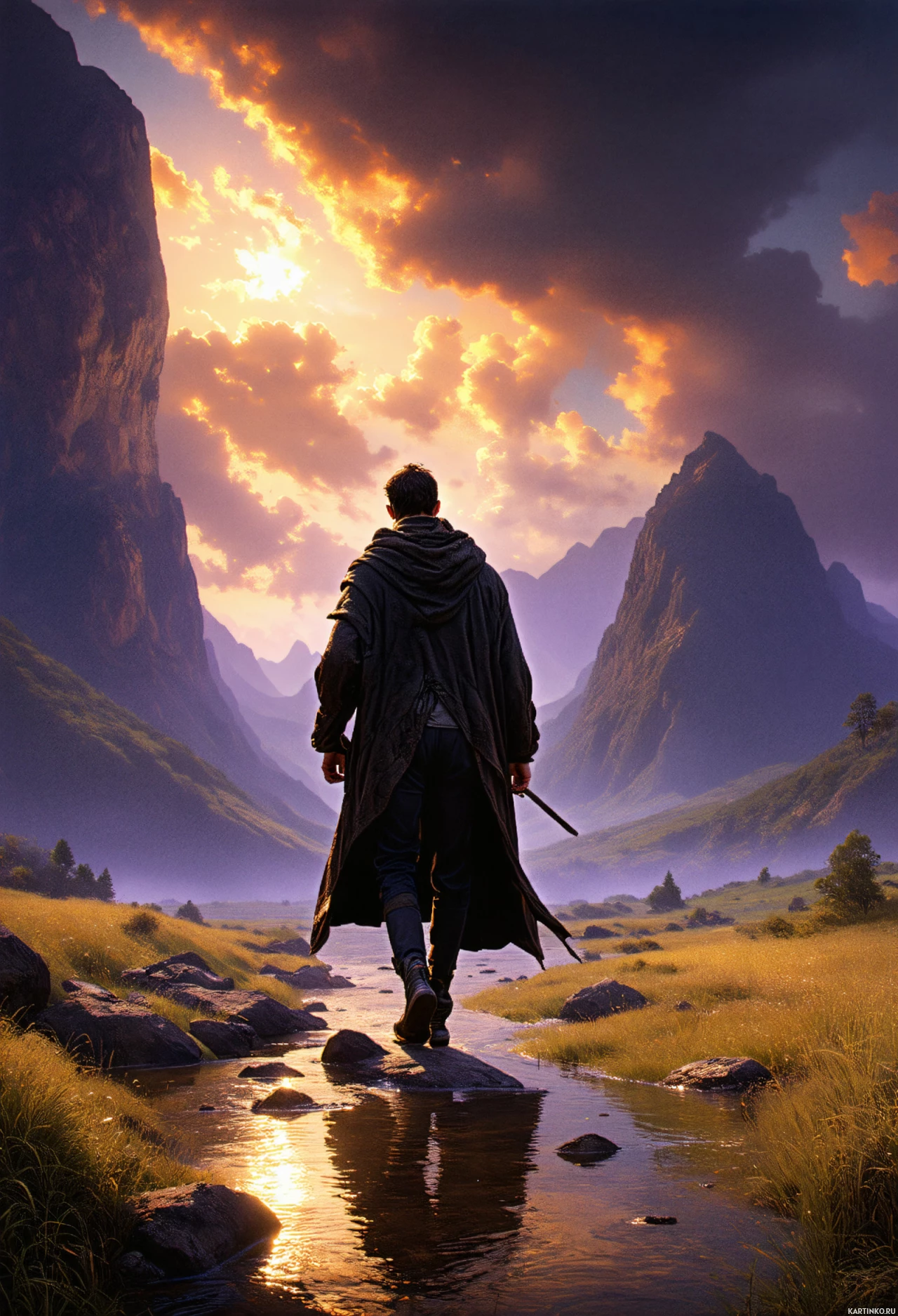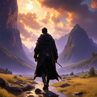 The image depicts a person walking away from the viewer, captured from behind. This figure is set in a fantastical landscape that appears to be inspired by scenes from popular culture, possibly movies or video games known for their epic and mystical environments. The character is silhouetted against a dramatic sky filled with clouds and rays of light, suggesting either sunrise or sunset. The terrain is rugged with mountains in the background, and there are hints of greenery around the figure, indicating a natural environment. The overall scene conveys a sense of solitude and an adventurous spirit.