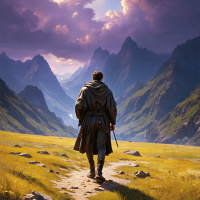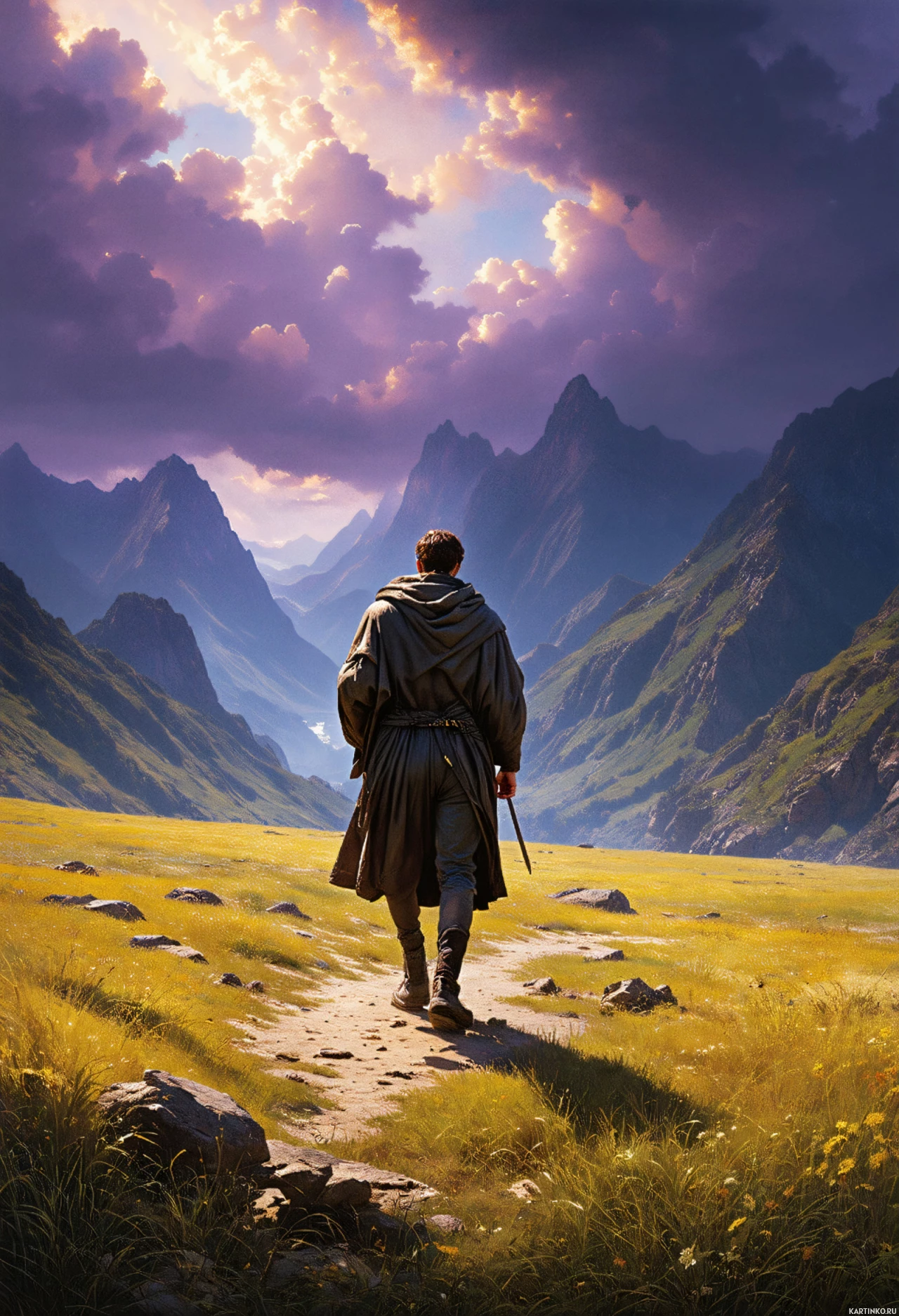 Картинка изображает фантастическую сцену: человек стоит на каменистой тропе, окружённый величественным горным пейзажем. Судя по одежде, он одет в средневековом или эпохи Возрождения стиле и держит посох или трость. Он повернут к зрителю спиной, позволяя рассмотреть его наряд и позу. Небо заполнено облаками, создающими ощущение надвигающейся бури. Внизу простирается долина с луговыми полями, уходящими вдаль, где можно увидеть водную гладь. Горные вершины покрыты снегом, что указывает на большую высоту над уровнем моря. В целом, картинка передаёт атмосферу одиночества и, возможно, ожидания или размышления, поскольку фигура, кажется, смотрит на что-то, что находится за пределами кадра. В работе сочетаются элементы, которые могут намекать на приключение или путешествие в фэнтезийном мире, учитывая одежду и грандиозные природные пейзажи.