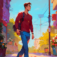 The image depicts a stylized scene with an animated male character in the center. He has short dark hair and is dressed in casual attire, wearing a red shirt, blue jeans, black sneakers, and a backpack on his shoulders. The character is walking away from the viewer down what appears to be a street lined with trees and buildings, under a clear blue sky. In the foreground, there is a small duck standing still in front of the character. On the right side of the image, slightly behind the character, there's an urban element resembling a mailbox. The artwork features vibrant colors and appears to be designed in an illustrative style commonly associated with video games or animation.