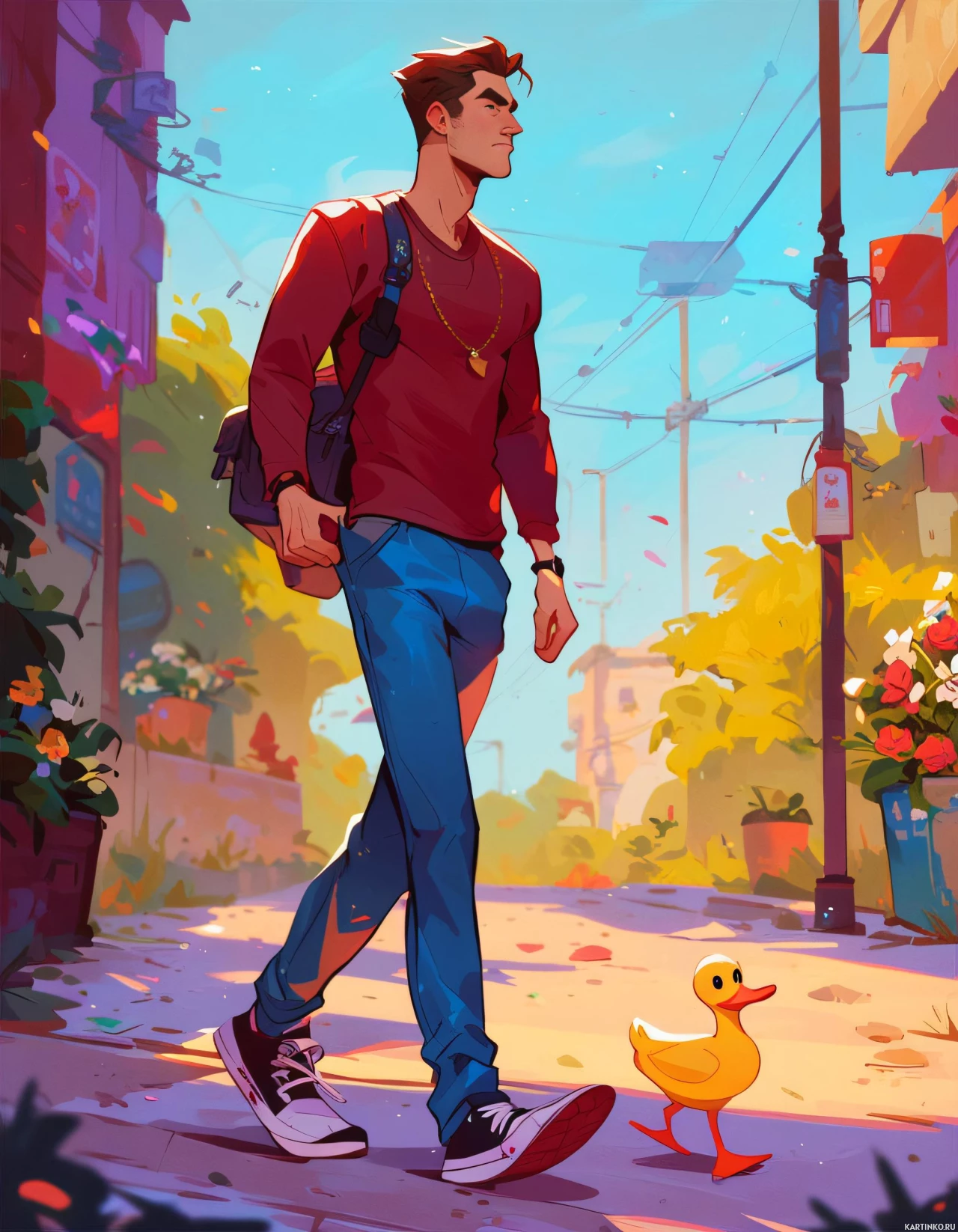 На картинке изображена стилизованная сцена с анимированным мужским персонажем в центре. У него короткие темные волосы, и он одет в повседневную одежду: красная футболка, синие джинсы, черные кроссовки и рюкзак за спиной. Персонаж уходит от зрителя по улице, вымощенной деревьями и зданиями, под чистым голубым небом. На переднем плане стоит маленькая уточка, неподвижно смотрящая вслед персонажу. Справа от него, немного позади, виден городской элемент, похожий на почтовый ящик. Картинка выполнена в ярких цветах и выполнена в иллюстративном стиле, характерном для видеоигр или анимации.