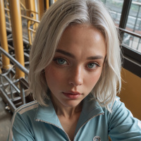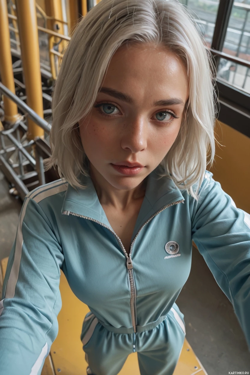 pale skin. * Her nose is small and straight, adding to her youthful appearance. * Her lips are full and pink, and she appears to be wearing lip gloss or lipstick. * The woman's outfit consists of a light blue tracksuit with white stripes on the sleeves and pants. * The tracksuit has a classic design with a zip-up front and elastic cuffs. * The material appears to be lightweight and breathable, suitable for athletic wear. * The white stripes add a touch of sporty flair to the outfit. * In the background, there are metal beams and pipes visible through large windows. * The industrial setting suggests that the woman may be in a factory or warehouse. * The natural light pouring in from the windows illuminates the scene and highlights the woman's features. * Overall, the image presents a young woman with striking white hair and pale skin, posing confidently in her athletic wear amidst an industrial backdrop.