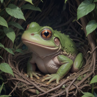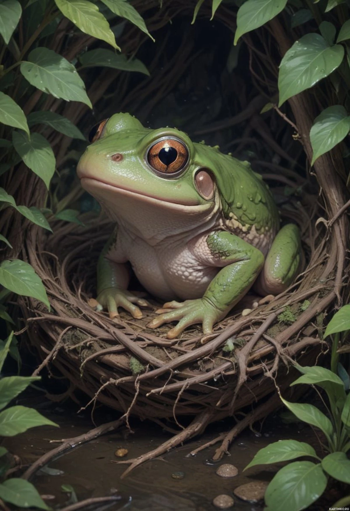 The image depicts a frog sitting inside a small nest-like structure. The frog has large,