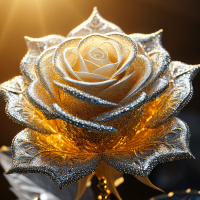 The image features a rose, which is prominently displayed in the center. The rose appears to have a glittery or metallic finish on its petals and possibly on parts of the stem as well, giving it an elegant and shiny appearance. There are visible droplets of what might be water or another liquid on various parts of the flower, adding a reflective quality that enhances its sparkle. The rose has multiple layers of petals and a full, round shape with a dark center where the stamens would typically be located. It's placed against a dark background which contrasts with the vibrant colors of the rose, allowing it to stand out prominently.