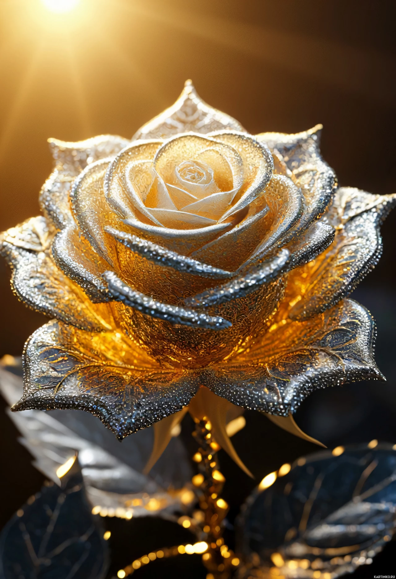 На картинке – роза, расположенная в центре. Её лепестки, а возможно, и часть стебля, покрыты мерцающим или металлизированным покрытием, что придает ей изысканный и блестящий вид. На разных частях цветка видны капли, возможно, воды или другой жидкости, что добавляет отражающий эффект и усиливает её сияние. У розы множество слоев лепестков и пышная, округлая форма с тёмным центром, где обычно располагаются тычинки. На тёмном фоне роза выделяется на фоне ярких цветов.