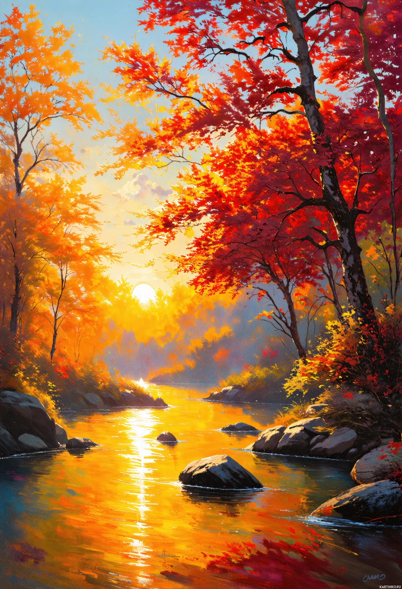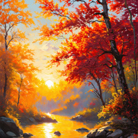 Картинка показывает безмятежную осеннюю сцену. На переднем плане – спокойная водная гладь, отражающая тёплые цвета деревьев. По обеим сторонам от воды разбросаны большие камни, а земля усыпана опавшими листьями от ярко-оранжевых до темно-красных. Листья на ближайших деревьях тоже окрашены в осенние тона. На заднем плане тянется линия высоких деревьев, их ветви переполнены зрелыми листьями. В небе – тёплые золотистые оттенки, как при восходе или закате солнца. В целом, картинка передаёт атмосферу умиротворения и живописности, свойственную осеннему дню в лесу.