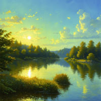 This image depicts a serene and picturesque landscape during what appears to be either sunrise or sunset. The focal point of the scene is a tranquil lake with calm waters reflecting the warm hues of the sky, suggesting the time of day is early morning or late evening. The shoreline of the lake is lined with tall trees and bushes, indicating a natural forest environment. There are also clouds in the sky, which adds to the idyllic atmosphere of the scene. The overall mood of the image is peaceful and inviting, evoking a sense of calm and tranquility often associated with such natural settings.