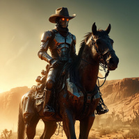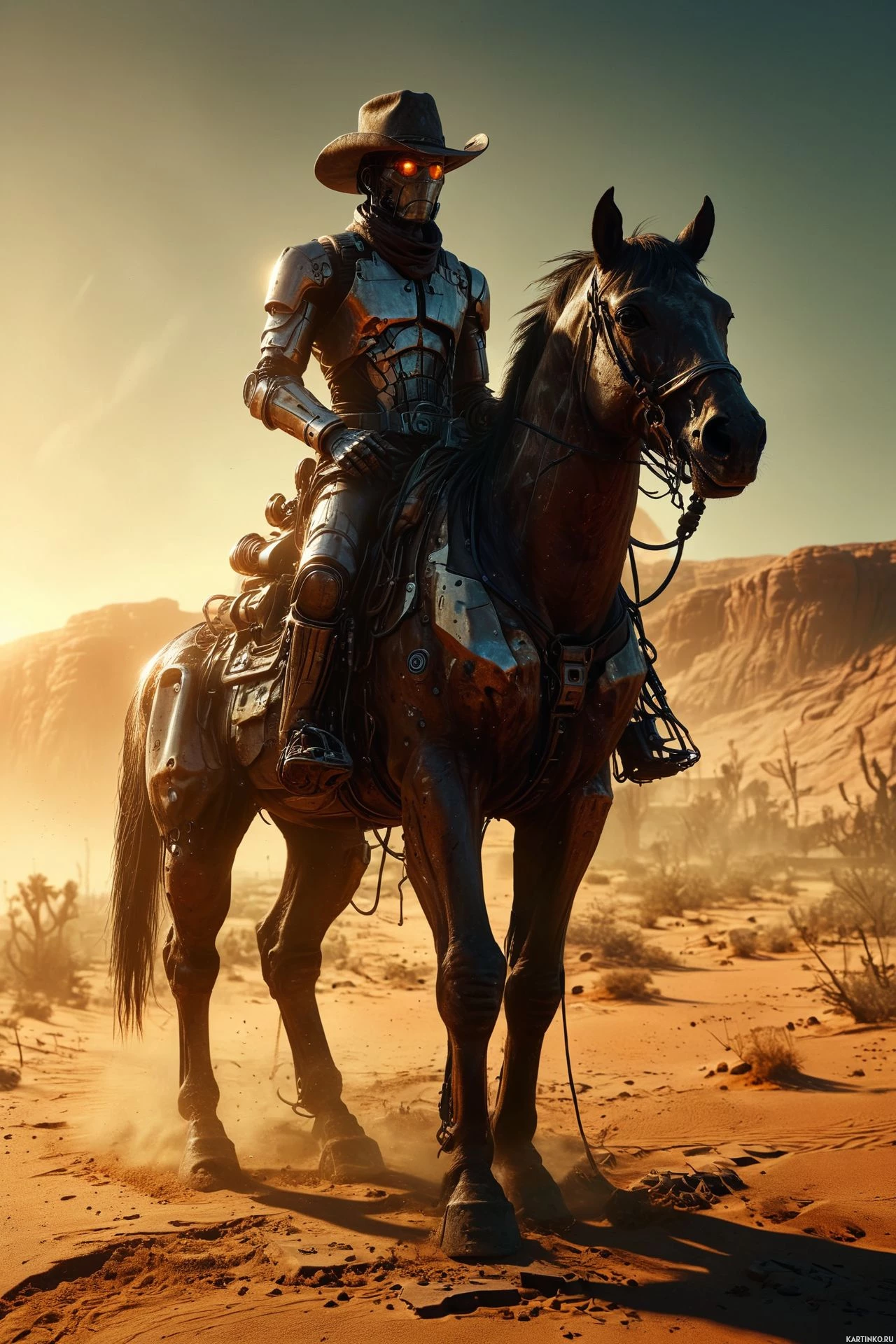 The image portrays a science fiction scene featuring a robot, who has taken on the role of a rider. This is evident by its armored appearance and the cowboy hat it's wearing, which are classic elements associated with Western riders. The robot is astride a horse that is moving through a desert landscape. The image combines the traditional theme of a cowboy with the futuristic concept of a mechanical rider, resulting in a striking blend of old and new.